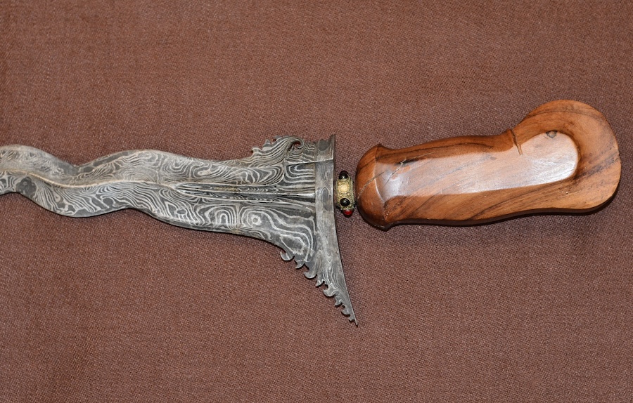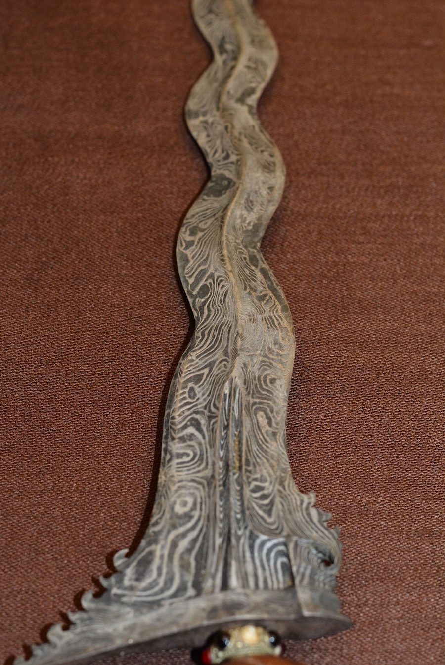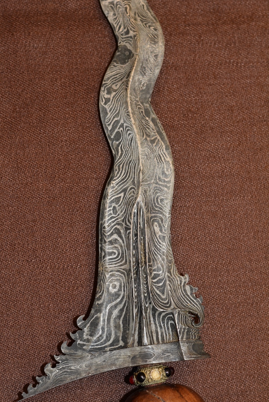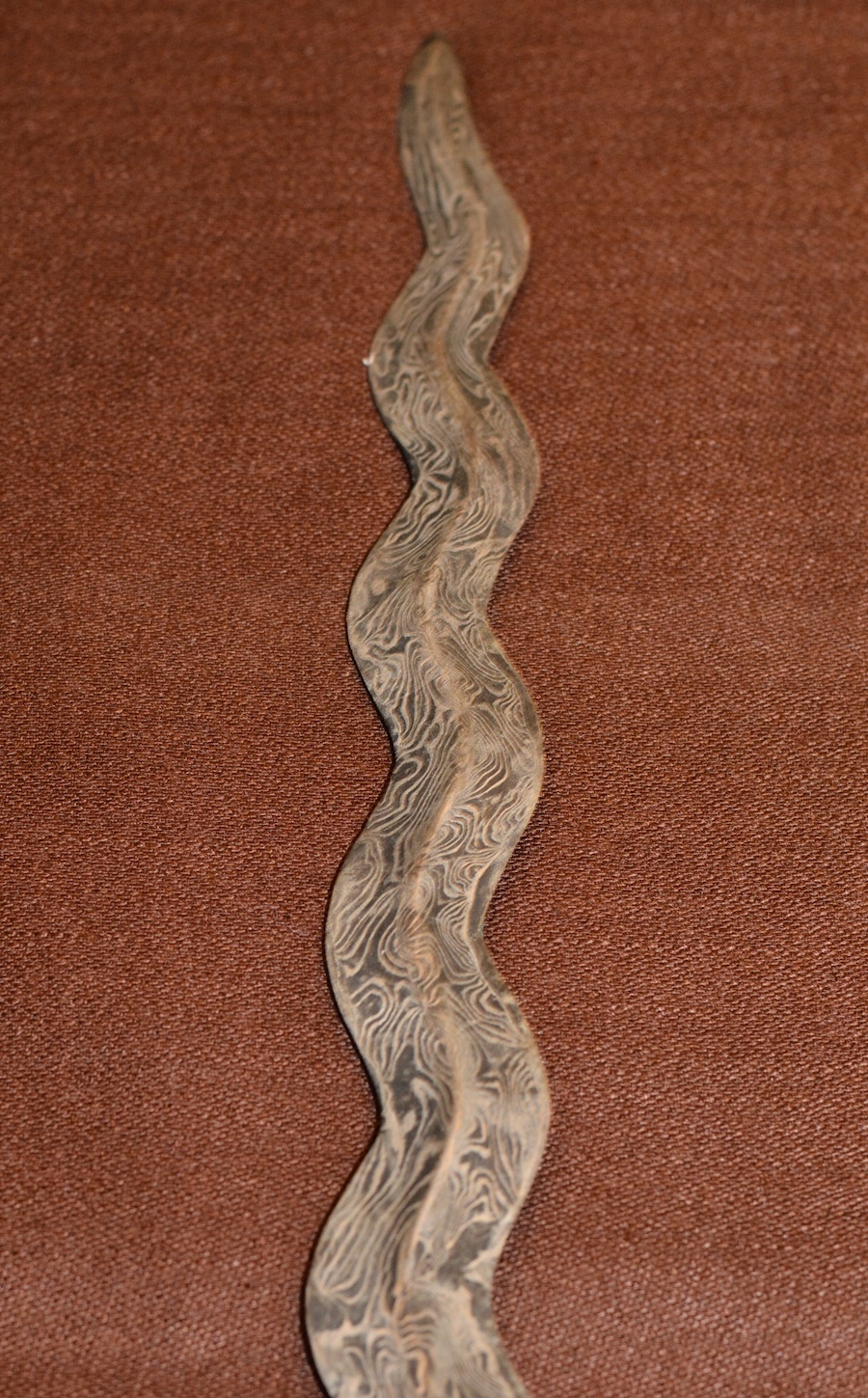 Чистка Криса: Купить любое средство для удаления ржавчины. Обработать клинок этим средством, подержать нужное количество времени (смотри инструкцию). Далее взять шлифовальную губку (с минимальной абразивностью) и аккуратно убрать ржавчину. При необходимости, нанести средство от ржавчины несколько раз и повторить действия с губкой. После чистки может поменяться цвет стали, он может стать светлее и может проявится памор – характерные рисунки на клинке (иногда рисунков нет, это зависит от технологии изготовления Криса).