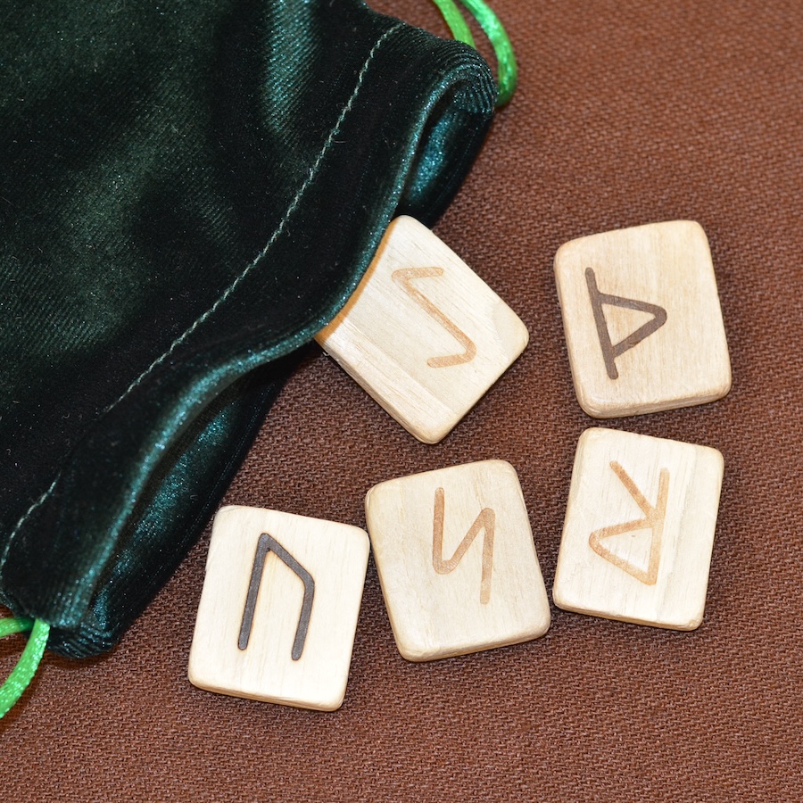 Набор деревянных рун. Орех. Размер руны 2,3*3 см. Цвет светлый. В наборе 25 рун. Мешочек зеленый бархат.